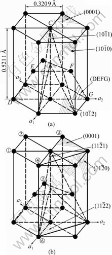 Fig.1 Unit cell of magnesium (①-⑥ represent atom position numbers): (a) Unit cell; (b) Orientation relations of various crystal faces
