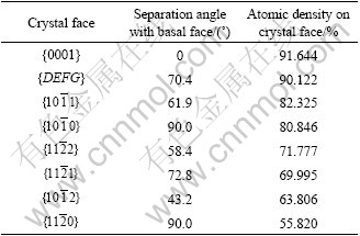 The crystal structure of magnesium is shown in Fig.1 from Ref.[1]. The calculation results of the separation angles between the typical crystal face and the basal face {0001}, and the atomic density of the crystal face are shown in Table 1. It can be seen from Table 1 that the crystal face {0001} is a closest-packed face, and the crystal face {DEFG} is a secondary closest-packed face. Because the difference of the atomic densities between them is very small, the two crystal faces are considered the closest-packed faces at the same time, and the energies of them are the lowest. In contrast, other crystal faces are not closest-packed faces.