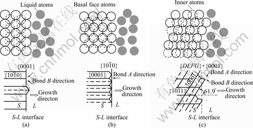 Fig.3 Sketch map of solid/liquid interface structure and crystal orientation: (a) S-L interface covered by {0001}; (b) S-L interface covered by