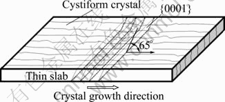 The slab of pure magnesium was prepared through Ohno continuous casting method by SUSUMU et al[15], and the separation angle between crystal face {0001} and crystal growth direction was measured through X-ray diffraction analysis; and the results are shown in Fig.4. The crystal face {0001} is parallel to the width direction of the slab, and the angle with the crystal growth direction is 65?. As mentioned above, the grain arrangement is fixed in the solidification structure after the solidification, so the grain arrangement in the solidification structure represents indirectly the crystal face arrangement on the solid/liquid interface in the solidification. Hence, the experimental results of SUSUMU et al can be used to verify the results of the theoretical analysis above. By comparison, the theoretical analysis, i.e., the segregation angle between the basal face and the crystal growth direction is 61.9? when magnesium grows in fashion of cellular crystal, is consistent with the experimental result of SUSUMU et al. The difference of 3? exists between the experimental result and the theoretical one, which is thought to be the result of the existence of the sub-boundary in pure magnesium structure.