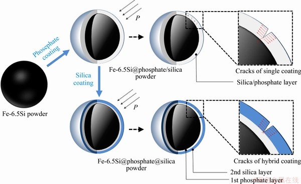 In our previous works, single phosphate layer was chosen to coat Fe-6.5Si powders and the effect of phosphate concentration on the microstructure and magnetic properties of Fe-6.5Si phosphate powder and SMCs was studied [25]. High phosphate concentration gives rise to stress accumulation in interface, and thus the coating layer becomes more susceptible to breakdown and damage. And for low concentration, the phosphate coating is too thin to be consolidated and compacted. A hybrid phosphate-silica coating (see Figure 1) is designed as insulation layer for Fe-6.5Si powders in this work, in attempt to establish a double inorganic coating structure with high withstand pressure, high heat resistance and high resistivity. With good adhesivity and high homogeneity, inner phosphate closely reacts with the powder matrix, forming a complete and compact coating. And external silica with high heat resistance and three-dimensional random network structure is expected to protect the inner layer from decomposition by high temperature. Especially, this hybrid phosphate-silica coating shows the structural advantage of crack deflection when compared with single phosphate or silica coating. The single phosphate or silica insulation layer will fail completely upon crack formation under high pressure, while the hybrid phosphate-silica coating remains completely or partially unbroken. In the absence of inner phosphate layer with some viscosity and elasticity, fracture energy is not enough to across the phosphate layer to bring about the plastic deformation, so the propagation path of crack will change instead of following the original path [26, 27]. This hybrid phosphate-silica coating was achieved by chemical coating combining sol-gel method and the microtopography and phase structure of it were investigated in detail. Evolution of the single phosphate, single silica coating and hybrid phosphate-silica coating during annealing has been explored to expound the enhanced magnetic performances of Fe-6.5Si SMCs with hybrid phosphate-silica coating.