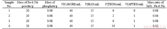 Gas atomized Fe-6.5Si powders with the size below 75 μm were passivated in the mixed solution of phosphoric acid (85%) and absolute ethyl alcohol (99.9%). The powder/solution ratio follows the rule of 2.5 g/mL to ensure that all particles are passivated. After being washed by absolute ethyl alcohol 3 times, the phosphated Fe-6.5Si powders were immersed into the mixture of aminopropyltriethoxysilane (APTES, 99%), absolute ethyl alcohol (99.9%) and deionized water (homemade) in definite proportions. After stirring for 60 min, the tetraethoxysilane (TEOS, 99%) was added to the mixture and kept stirring for 3 h in (40±2) °C thermostat water bath. Powder products were washed with absolute ethyl alcohol and then dried at 100 °C for 60 min under vacuum. The obtained composite powders were compacted into toroidal core (outer diameter=26.9 mm, inner diameter=14.5 mm, .0 mm) under the pressure of 1.1 GPa and annealed at 600 °C for 60 min under mixture of Ar and H2 gas atmosphere. For comparison, Fe-6.5Si SMCs coated by single phosphate and single silica were also prepared from the phosphated Fe-6.5Si powder and silica coating powder under the same condition.
