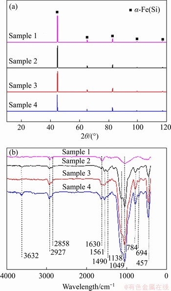 Figure 4 XRD patterns (a) and FTIR curves (b) of Fe-6.5Si powders coated with hybrid phosphate-silica