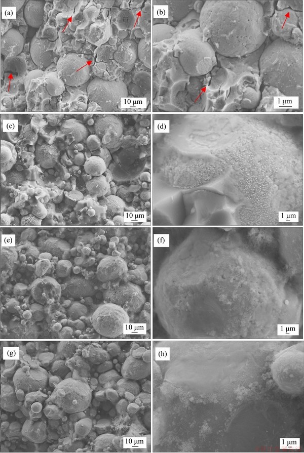 Figure 3 illustrates the surface morphology of Fe-6.5Si powders coated with hybrid phosphate-silica. It is seen from Figure 3(a) that only small amount of SiO2 particles are adhered on the surface of Fe-6.5Si powders without adding APTES. The smooth surface of the Fe-6.5Si powder tends to be rough and is wrapped with continuous flocs of SiO2 with 1 mL addition of APTES. The amount of those flocculent SiO2 increases significantly with increasing the TEOS and some flocculent aggregative nano-SiO2 particles exist in free state in Figures 3(b)-(d). After surface modification by APTES,a nonpolar layer is formed on the surface of Fe-6.5Si powders, which makes it possible for SiO2 to adhere on the powders by dehydration and condensation of TEOS [28]. Silica coatings were fabricated by sol-gel method via hydrolysis and polycondensation of TEOS (see Eqs. (1) and (2)). As the silica source precursors, the addition of TEOS mainly affects the coating amount and thickness of SiO2 layer.
