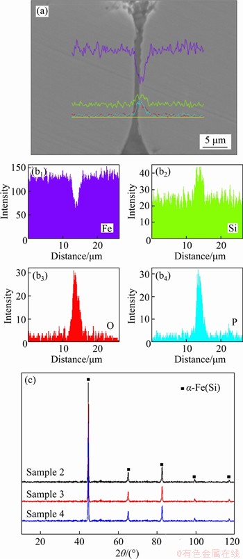 Figure 6 Cross-sectional image (a) and corresponding elements scanning (b) of Fe-6.5Si SMCs coated with hybrid phosphate-silica (sample 2); XRD patterns (c) of Fe-6.5Si SMCs coated with hybrid phosphate-silica
