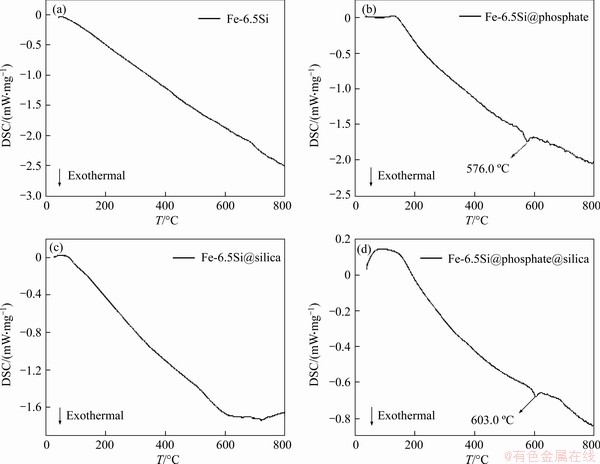 The DSC thermograms of Fe-6.5Si powder and Fe-6.5Si powders coated with single phosphate, single silica and hybrid phosphate-silica layers are demonstrated in Figure 8. For raw material of Fe-6.5Si powders without coating layer, no obvious exothermic and endothermic peaks appear in the DSC thermograms as the temperature rises to 800 °C (Figure 8(a)). As seen in Figure 8(c), there is also no obvious characteristic peak for Fe-6.5Si powders coated with single silica. SiO2 usually exists in form of α-SiO2 at room temperature, which transforms into β-SiO2 and γ-SiO2 as the temperature rises to 573 °C and 846 °C, respectively. The transformation is supposed to cause heat variations at corresponding temperatures; however, no obvious endothermic and exothermic peaks are observed and this might be ascribed to the very low content of SiO2 coatings. As for DSC curves of Fe-6.5Si powders coated with single phosphate and hybrid phosphate-silica coating layer, an exothermic peak at 576 °C and 603 °C is presented in Figures 8(b) and (d), respectively, and is attributed to the crystallization of amorphous FePO4. Crystallization of amorphous FePO4 was reported to occur between 500 °C and 600 °C [35] and decreased the resistivity, which is detrimental for powder particle insulation. Compared with single phosphate, the hybrid phosphate-silica coating exhibits a higher crystallizing temperature, and the outer silica layer significantly improves the stability of amorphous FePO4 by acting as a thermal barrier that successfully retards the crystallization temperature of FePO4.