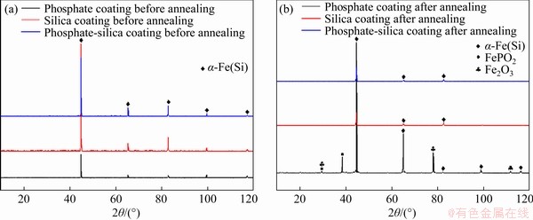 XRD patterns of Fe-6.5Si powders coated with single phosphate, single silica and hybrid phosphate-silica layer before and after annealing at 600 °C are displayed in Figure 9. XRD patterns of Fe-6.5Si powders with different coatings before annealing in Figure 9(a) are very similar for each other and only diffraction peak of α-Fe(Si) phase is observed.Peaks of FePO4 and Fe2O3 are detected from the XRD curve of Fe-6.5Si powders coated with phosphate after annealing in Figure 9(b). The passivation reaction product of phosphate for iron is the mixture of Fe3(PO4)2 and FePO4, and the latter takes relatively major proportion [36, 37]. FePO4 is prone to be reduced and decomposed into Fe2P at high temperatures and reductive environment [38]. Formation of Fe2O3originates from the oxidation of Fe2P and unprotected Fe-based basic material after the coating is destroyed. Thus the single phosphate coating is easier to crystallize and decompose with the rise of temperature and existence of reducing gas compared with single silica and hybrid phosphate-silica coating for Fe-6.5Si powders.