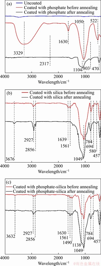 Figure 10 FTIR curves of Fe-6.5Si powders coated with phosphate (a), silica (b) and hybrid phosphate-silica (c) layer before and after annealing