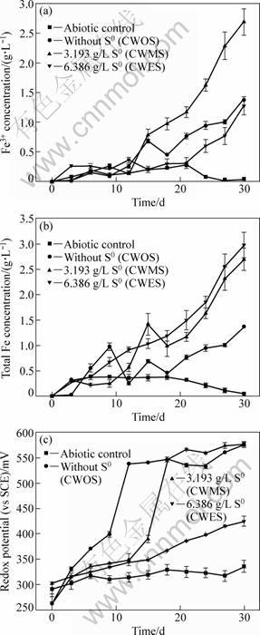 Many researchers [14] reported that iron (Fe3+ and Fe2+) played a key role in the bioleaching of chalcopyrite. The distinguishing feature of both direct and indirect mechanisms of sulphide oxidation was necessary for ferric ions to participate in the mineral dissolution. Therefore, the concentrations of Fe3+, total iron and redox potential were measured and analyzed. Ferric iron concentrations in CWMS were initially kept constant (Fig. 2(a)), subsequently increased from the 12th day and finally reached 2.69 g/L, which were towered over that in CWOS and CWES. This indicated that ferric ions, as an oxidant, could accelerate the dissolution of chalcopyrite (Fig. 1 and Fig. 2(a)). Furthermore, the difference of Fe3+ concentration could be attributed to adding different levels of sulfur.