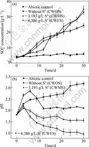 Fig. 3 Variation of SO42- ions (a) and pH (b) during chalcopyrite bioleaching