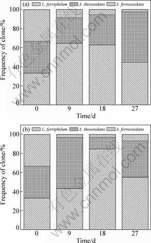 When elemental sulfur was added, the microbial consortia changed rapidly in CWMS (Fig. 4(b)), especially for A. ferrooxidans and A. thiooxidans. Examination of both solid and liquid phases showed that A. thiooxidans was the dominant microorganism (53%) due to the oxidation of elemental sulfur at the first stage, then with the elemental sulfur consumption, A. ferrooxidans proportion was significantly increased up to 85% while the presence of A. thiooxidans was decreased to approximately 12%. At the last stage, however, the proportion of A. ferrooxidans decreased to 50%, and A. thiooxidans gradually increased to 38%. The proportion of L. ferriphilum stabilized at approximately 3% during the first 18 days, followed by an increase thereafter. Compared to CWOS, sulfur oxidizer utilized additional elemental sulfur rather than chalcopyrite at the first stage. Therefore, the proportion of A. thiooxidans increased and became the dominant species. The proportion of L. ferriphilum decreased in CWMS. This reduction was much more obvious for CWMS than for CWOS, which also indicated that additional sulfur inhibited the iron-oxidizing metabolism and led to the decease of special iron-oxidizing microorganisms, similar to the evidence from the analysis of total iron, redox potential and Fe3+. Due to the existence of two kinds of energy metabolism (iron/sulfur metabolism) in A. ferrooxidans, it could evade the inhibition of iron-oxidizing metabolism by means of the alternative sulfur- metabolism function, thus, its proportion did not decrease but increased at the middle of process. Furthermore, the results showed that A. thiooxidans together with A. ferrooxidans initially oxidized the elemental sulfur to sulfuric acid in bioleaching system with additional sulfur, which could inhibit the formation of passivation layer, then an exuberant growth of A. ferrooxidans maintained the high concentration of ferric iron (Fig. 2(a)), and promoted the dissolution of chalcopyrite [24]. A. thiooxidans also played a key role in dispelling intermediate including jarosite, sulfur and other reduced sulfide at the last stage of bioleaching process. Similar to CWOS, the low proportion of L. ferriphilum also showed its less importance compared to A. ferrooxidans and A. thiooxidans.