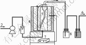 Fig. 2 Schematic diagram of boiling fluidized bed roasting reactor: 1—Air pump; 2—Air inlet; 3—Rotameter; 4—Resistance furnace; 5—Boiling fluidized bed reactor; 6—Gas outlet; 7—Electronic thermo-controllers for transformers; 8—Gas collector