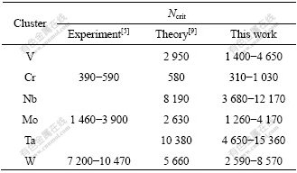 =1.49时,其变化规律与以上一样,对应的临界转变尺寸点为Ncrit, 2。由以上分析可以得出,Cr、Mo、W、V、Nb和Ta金属元素纳米微粒随尺寸降低时将发生bcc→fcc的结构转变,这与TOMANEK等[9]的理论结论完全一致,而HUH等[5]也在实验中证明了Cr、Mo、W等元素纳米微粒存在这种结构转变。进一步分析,还发现无论是球形还是正四面体形,同一元素纳米微粒在临界尺寸时的临界结合能均相等,对Cr、Mo、W、V、Nb和Ta元素其临界结合能分别为4.733,3.358,6.872,6.036,7.500和8.005 eV。