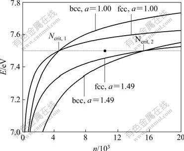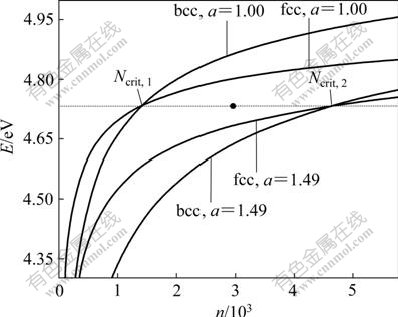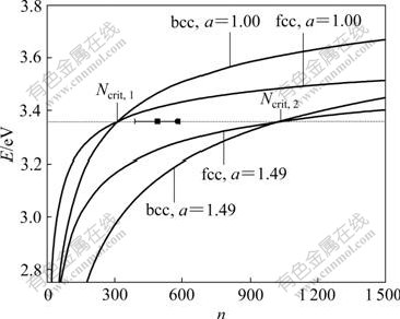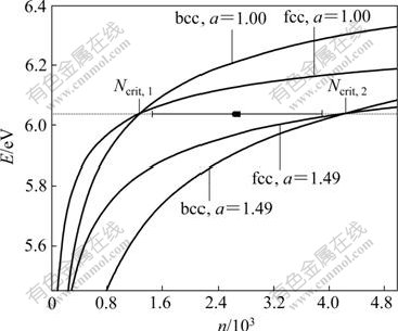 =1.00时,其交点为Ncrit, 1,n>Ncrit, 1时,bcc结构的结合能高于fcc结构结合能,?E>0,此时bcc结构较为稳定;n<Ncrit, 1时,fcc结构的结合能将高于bcc结构结合能,?E<0,此时fcc结构更稳定。由结合能判据可知,上述元素的纳米微粒随尺寸降低时,由于不同结构的结合能不同,微粒在Ncrit, 1点发生稳定结构转变,由bcc结构转变为fcc结构,Ncrit, 1即为临界转变尺寸点,可由式(11)求得;