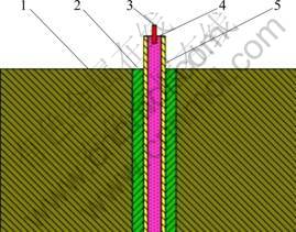 Fig. 1 Schematic diagram of arrangement: 1—Mould; 2—Ferrite tube; 3—Detonator; 4—Explosive; 5—Aluminium tube