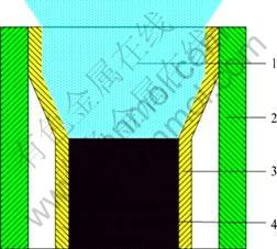 Fig. 2 Schematic diagram of interior explosive welding: 1—Gaseous detonation products; 2—Ferrite tube; 3—Aluminium tube; 4—Explosive