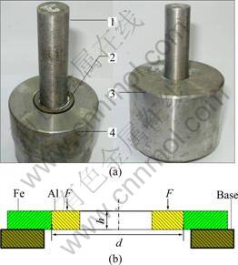All the tests were performed on the CMT 5105 electronic universal testing machine with compression test under axial load, flattening test under radial load and compression-shear test under shear stress. Figure 3 shows the schematic diagram of the compression-shear test and the mould. The increasing loading was restricted to the aluminium layer only by the squeeze head in this test. The test stopped after the stroke of the squeeze head exceeded 1 mm. Meanwhile, the peak value of the loading was obtained in the machine. The shear strength of the joint can be calculated by Eq. (1), where τ is the shear strength; F is peak value of the force loading on the aluminium layer; A is the fracture area in the interface; d is the section diameter of fracture area in the interface; h is the height of the sample; and π is the ratio of circumference.