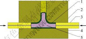 Fig. 4 Schematic diagram of hydroforming process for tee extrusion: 1—Tube blank; 2—Upper die; 3—Hydraulic cylinder; 4—Lower die; 5—Liquid