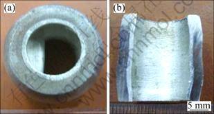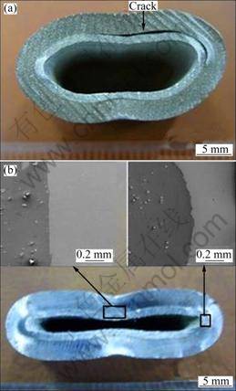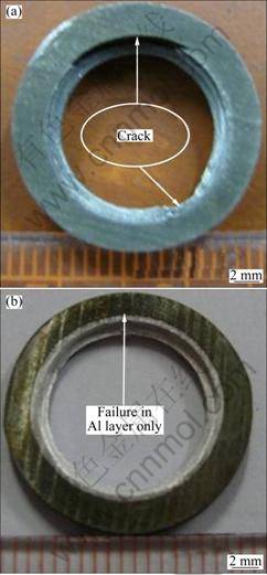The samples were compressed by 35% in compression test. As shown in Fig. 5(a), the aluminium layer bulges during the deformation process. This indicates that the aluminium layer separates from the ferrite layer due to the weak interface, showing the poor bonding property. But no bulging is detected in the sample as shown in Fig. 5(b). In order to observe the interface better, the sample is cut in half. No crack is detected according to the view of the corresponded interface. The clad tube presents good-bonding property, bearing large and axial deformation.