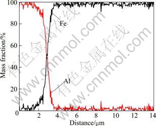 The micrographs of the interface shown in Fig. 8 correspond to tube with good-bonding properties. Position A is in the initiation, while positions B and C are in the middle and the end of the tube respectively. The differences could be witnessed easily from the interfaces of the parts following the detonation direction. In the initiation part, the Fe/Al clad tube bonds together directly, having little transition layer. In the middle of tube, it shows the wave shape at the interface which reveals the good-bonding properties depicted above. And in the end, it exhibits more transition layers in the interface, showing that the Fe and Al layers joint together in melting layer. These differences are related to the increasing detonation energy from the initiation to the end that will be not enough for the binding when it is too low and lead to severe fusion at the interface which is bad to the deformation of clad tube when it is over high. It is also concluded by the analysis of differences in the clad tube that the explosive welding window of Fe/Al clad tube is limited. The Fe and Al element distribution of interface in the middle of tube is shown in Fig. 9. It is detected that the thickness of the layer is less than 3 μm. And from the distribution of Al and Fe which varies gradually, it could be speculated that there is no intermetallic compound generated at the interface after explosive welding.