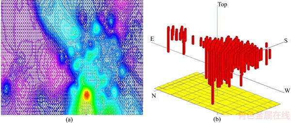 Figure 2 Geo-physical and geo-chemical map of deposit (a) and distribution map of ore deposit boreholes (b)