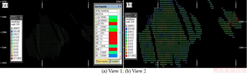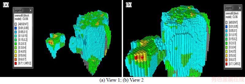 The block modeling was performed after modeling the exploration boreholes and the operation of grade flattening and determining the grade ranges. Figure 4 displays the deposit block model of this mine.