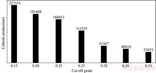 Figure 9 Effect of the changes of cutoff grades of the leaching method in different years on the total cathode production of leaching and concentration methods
