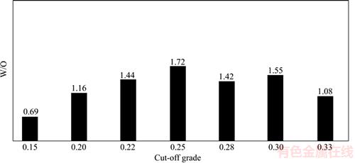Figure 10 Variation of amount of stripping ratio W/O (waste to ore) by optimum cutoff grades of processing methods