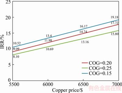 Figure 14 Copper price changes on internal rate of return (IRR) of this mine in different cutoff grades (COG) of leaching method