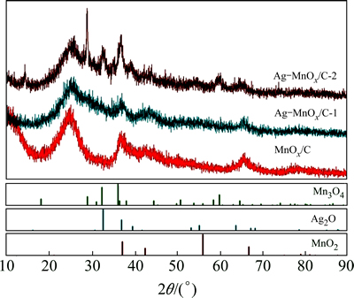 XRD patterns for the MnOx/C and Ag-MnOx/C composites are shown in Fig. 1. For comparison, the standard patterns for MnO2(PDF 30-0820), Mn3O4(PDF 80-0382) and Ag2O(PDF 12-0793) are included in the bottom of Fig. 1. For all the composites, the broadened peaks located at about 2θ=25.0° are assigned to graphite (002) of the carbon support. Besides, for the MnOx/C, the broadened peaks located at about 2θ=36.8o and 66.2° are attributed to γ-MnO2 (100) and (110), respectively. While for the Ag-MnOx/C-1 sample, the diffraction peak positions and relative intensities are similar to those for the MnOx/C except for the broadened peak located at the range from 28° to 34° which may be attributed to Mn3O4, and no obvious peaks for silver species can be observed, which means that the silver species are either in amorphous or in very small particle size. However, for the Ag-MnOx/C-2 sample, the peaks located at about 2θ=28.9°, 32.4°, 36.0° and 59.9° are assigned to Mn3O4 (112), (103), (211) and (224), respectively. Besides, the peaks located at about 2θ=32.4° and 37.1° may be overlapped with the Ag2O (111) and MnO2 (100), respectively.