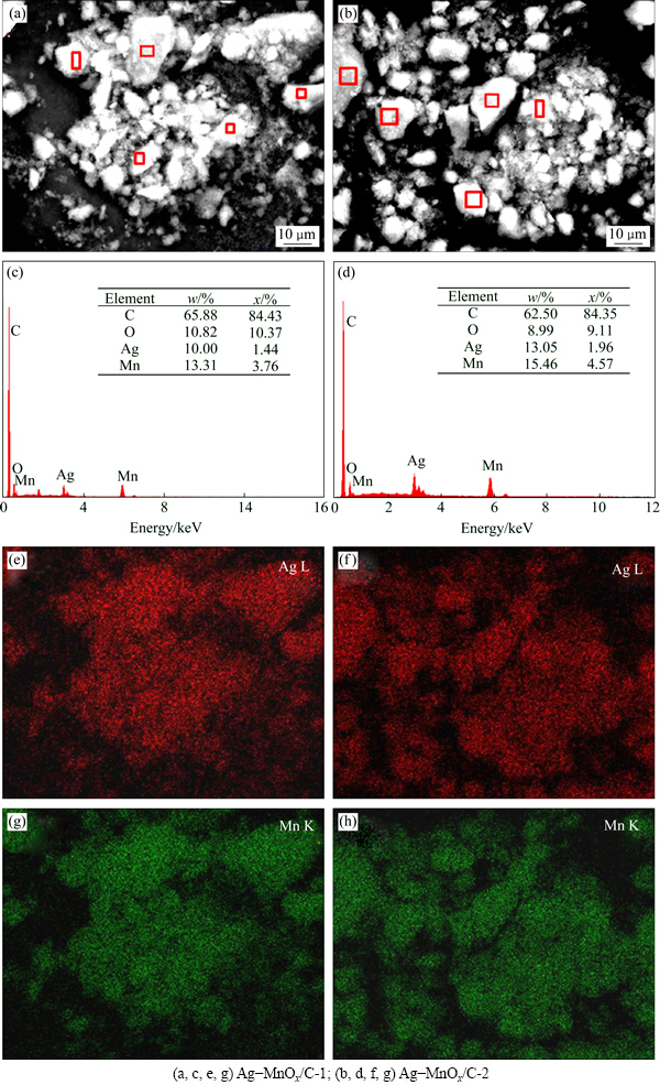 SEM images of the Ag-MnOx/C composites are shown in Figs. 2(a) and (b). It can be observed that the white and the relatively black regions for both samples can be distinguished. In order to further determine the different regions, the EDS experiments were performed and the results are also shown in Fig. 2. It is clear that Ag and Mn species mainly present on the white regions. The Mn and Ag contents on the Ag-MnOx/C-2 composite, averaged from the five points presented in Fig. 2(b), are 15.46% and 13.05% (mass fraction), higher than 13.31% and 10.00% for the Ag-MnOx/C-1, respectively. The corresponding atomic ratio of the x(Ag)/x(Mn) on the surface of Ag-MnOx/C-2 is 0.43, much higher than that (0.38) on the Ag-MnOx/C-1. It should be pointed out that the amounts of KMnO4 and AgNO3 used in the experiments are equal and the x(Ag)/x(Mn) atomic ratio is 0.40 combined with the results of XRF for the filtrates. Thus, it can be concluded that some Ag species for the Ag-MnOx/C-1 sample are agglomerated or coated by the carbon, while more Ag species present on the Ag-MnOx/C-2 surface.