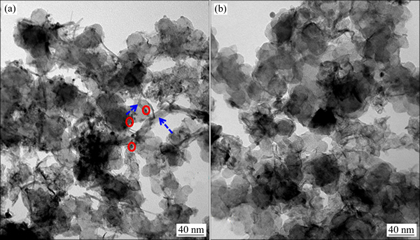 Fig. 4 TEM images for Ag-MnOx/C-1 (a) and Ag-MnOx/C-2 (b) samples