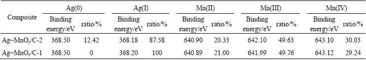 The Ag 3d5/2 and Mn 2p3/2 XPS spectra for the Ag-MnOx/C composites are presented in Fig. 3. According to Ref. [18], the Ag 3d5/2 peak can be separated into two peaks at about 368.20 and 368.50 eV, corresponding to Ag2O and Ag(0), respectively, and the corresponding peak area percentages of each silver species are shown in Table 1. For the Ag-MnOx/C-1, a sharp peak without any additional peak shoulder suggests that there is very little other silver species and the main silver species is Ag2O, while for the Ag-MnOx/C-2 composite, the content of Ag(0) reaches 12.42%. For the Mn 2p3/2 XPS, taking the shake-up peak into account, the peak can be separated into three peaks at about 640.89, 642.20 and 643.12 eV, corresponding to the Mn(II), Mn(III) and Mn(IV) [19], respectively, and the corresponding peak area percentages of each Mn species are also shown in Table 1. The percentages of each Mn species are comparable, i.e., the preparation routes have no obvious effect on the valent state of Mn.