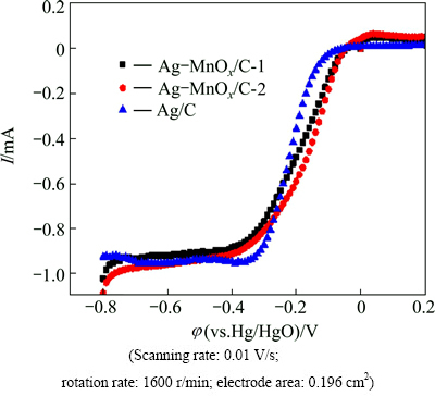 To investigate the activity of the Ag-MnOx/C composites toward the ORR, linear scanning voltammetry (LSV) measurements were performed on the catalyst film covered RDE in O2-saturated 0.1 mol/L NaOH solution with a rotation rate of 1600 r/min, as shown in Fig. 6. For comparison, the polarization curve for the 30% Ag/C is also presented. Though the onset potentials for the ORR on both Ag-MnOx/C samples are comparable (-0.051 V), about 0.019 V more positive than that on Ag/C. The half-wave potential (
