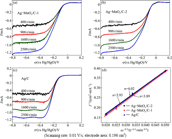 =-0.60 V) are shown in Fig. 7. With the rotating speed increasing, the Ilim of the ORR increases, while the ORR onset potential is kept almost unchanged. The electron transfer numbers calculated for the Ag/C, Ag-MnOx/C-1 and Ag-MnOx/C-2 are 3.93, 3.89 and 4.02, respectively. Though these values are all close to four, which indicates that the overall ORR process is an apparent 4e- pathway, the value for the sample Ag-MnOx/C-2 is still slightly higher than those for Ag-MnOx/C-1 and Ag/C, which means that less