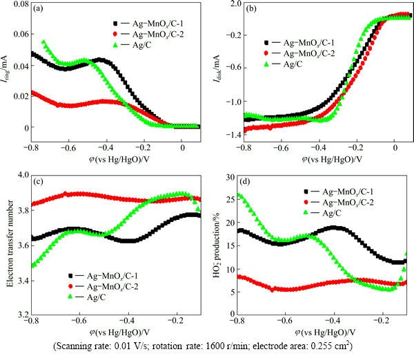 To further verify the ORR selectivity on the composites, the RRDE measurements were done to detect the HO2- formation. The RRDE polarization curves of the catalysts with the rotation rate of 1600 r/min in O2-saturated 0.1 mol/L NaOH solution are shown in Fig. 8 which take on the same characteristics as that shown in Fig. 6. The correlations between the ring currents, which indicate the formation of HO2-, and the disk potentials are presented in Fig. 8(a). It can be seen that the HO2- output on the Ag-MnOx/C-2 is much lower than those observed on the Ag-MnOx/C-1 and Ag/C when the potential is lower than -0.30 V. The electron transfer numbers and the HO2- productions are plotted as functions of the disk potentials and shown in Fig. 8(c) and Fig. 8(d), respectively. It can be observed that during the ORR process, the HO2- production on the Ag-MnOx/C-2 is obviously lower than that on the Ag-MnOx/C-1. At the potential of -0.60 V,