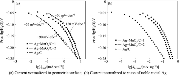 To compare the intrinsic catalytic activities, the ORR kinetic currents (calculated by Jk=J×Jlim/(Jlim-J)) normalized to the geometric surface area and the mass of silver derived from Fig. 8(b) are shown in Figs. 9(a) and (b). For the Ag-MnOx/C composites, the Tafel slopes could be divided into two parts, about -55 and -120 mV/dec at low and high overpotentials, respectively. The comparable values of Tafel slopes for the Ag-MnOx/C composites and Pt/C indicate that the ORR mechanism is the same, that is, the one-electron transfer is the rate-determining step at low overpotentials and the two-electron transfer reaction is the rate- determining step at the higher overpotentials [16]. The Tafel slopes for the Ag/C are about -60 and -90 mV/dec at low and high overpotentials, respectively. At the potential of -0.10 V, the ORR kinetic current density normalized to the geometric surface area obtained on the Ag-MnOx/C-2 composite is 0.92 mA/cm2, much higher than those observed on the Ag-MnOx/C-1 (0.56 mA/cm2) and Ag/C (0.12 mA/cm2). Meanwhile, the corresponding specific mass kinetic current on the Ag-MnOx/C-2 composite is 46 mA/μg, which is 23 times that on the Ag/C (2 mA/μg).