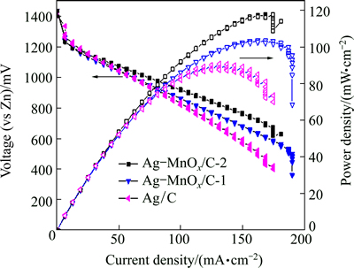 3) The peak power density of zinc-air battery with the Ag-MnOx/C-2 air electrode reaches 117 mW/cm2, which is much higher than those with the Ag-MnOx/C-1 and Ag/C as the cathode catalysts.