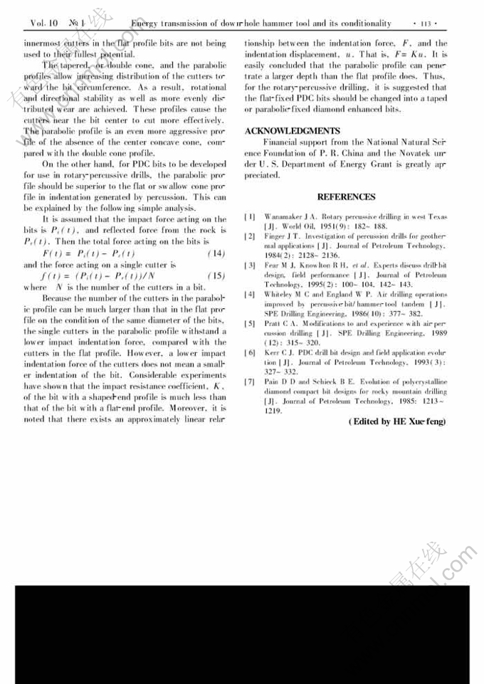 Abstract: By analyzing the efficiency of transmission of impact energy in down-hole hammers and its affecting factors, it has been revealed that the percussive action of down-hole hammers can greatly increase the rate of penetration in shallow well drilling, but its efficiency will be deeply decreased in very deep well drilling. Further analysis showed that there exists a reasonable mass matching of the piston to the bit for different formations. Meanwhile, in an effort to effectively transmit the impact energy from rotary-percussive drilling, it is suggested that the roller-conical bits widely used in petroleum industry and the recently developed flat-fixed PDC bits should be changed into parabolic-fixed diamond enhanced bits.