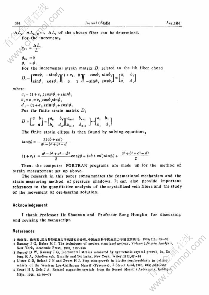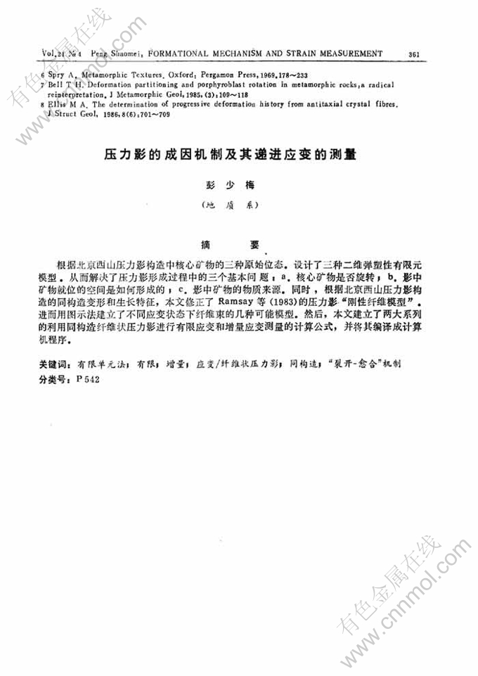 摘 要:根据北京西山压力影构造中核心矿物的三种原始位态。设计了三种二维弹塑性有限元模型。从而解决了压力影形成过程中的三个基本问题:a.核心矿物是否旋转;b.影中矿物就位的空间是如何形成的;c.影中矿物的物质来源。同时,根据北京西山压力影构造的同构造变形和生长特征,本文修正了Ramsay等(1983)的压力影“刚性纤维模型”。进而用图示法建立了不同应变状态下纤维束的几种可能模型。然后,本文建立了两大系列的利用同构造纤维状压力影进行有限应变和增量应变测量的计算公式,并将其编译成计算机程序。
