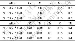 The compositions of the Ni-Cr-Al based alloys are listed in Table 1. In the text below, the alloys were simply called Ni-12Cr-6.8Al, Ni-16Cr-6.8Al and Ni-20Cr- 6.8Al alloys, respectively. The alloys were cut into samples with size of 10 mm×10 mm×4 mm from the original ingots obtained by 3-4 times arc melting of pure metal in argon. Then, the samples were polished through No.1000 carborundum paper before being washed in alcohol and acetone. The preoxidation treatment was carried out in a horizontal tube furnace with three heating zones at 1 273 K for 50 h with the nitrogen flow rate of 0.03 m3/h.
