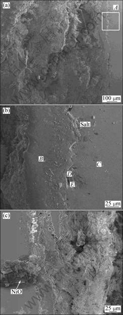 Fig. 4 SEM images of cross-section for Ni-12Cr-6.8Al alloy after hot corrosion at 873 K for 100 h: (a) Low magnification; (b) High magnification of region A in Fig. 4(a); (c) NiO precipitation and pitting