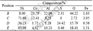 Although the resistance to hot corrosion of the alloy is remarkably improved due to the oxide layer, the poor binding force makes it easy to spall from the substrate after hot corrosion. After spalling of the corrosion layer, internal oxidation in the substrate occurs, as shown in Fig. 8(b). The thickness of internal oxidation zone is about 100 μm, and the composition is poor in Cr and Al but rich in Ni and O. At the region about 50 μm from the surface, the shape of the oxides is chock-like (Fig. 8(b), position B), while the oxides become tiny with increasing distance (Fig. 8(b), position C). In addition, the content of sulfur in positions B and C is more or less the same with that in Table 4.