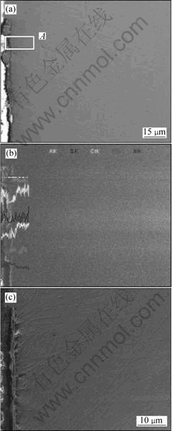 Fig. 6 SEM images of cross-section for Ni-20Cr-6.8Al alloy after hot corrosion at 873 K for 100 h: (a) Low magnification; (b) Line scanning analysis; (c) High magnification of region A