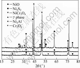 Figure 2 shows the XRD patterns of the as-cast and preoxidized alloys before hot corrosion. All the as-cast samples are composed of γ phase (solid solution) and γ' phase (Ni3Al), as shown in Fig. 2(a). After preoxidation, an oxide layer composed of mainly alumina with minor chromia and spinel is generated on the surface of the as-cast alloy (Fig. 2(b)). This is in agreement with the theory by FELIX [12] that if the mass ratio of Cr to Al is less than 4, the alloy would be mainly covered by alumina layer. From the microstructure of the oxide layer in Fig. 3, it can be seen that although the chemical compositions of oxide layer are almost the same, there are still some obvious differences (see Table 2). Preoxidized Ni-16Cr-6.8Al alloy has the thickest oxide layer which is not easy to spall (Fig. 3(b)), while preoxidized Ni-20Cr-6.8Al has the least protective oxide layer (Fig. 3(c)).