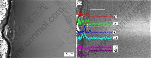 Fig. 10 SEM image (a) and line scanning result (b) of cross-section for preoxidized Ni-20Cr-6.8Al alloy after hot corrosion at 873 K for 100 h