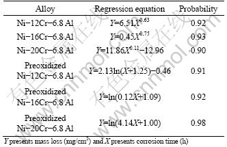 The appearance of a molten salt layer is known to be a fundamental prerequisite for the occurrence of hot corrosion [2]. Although the melting point of sodium chloride is 1 071 K and the eutectic melting point for sodium chloride and sodium sulfate is about 898 K. NIU et al [2] demonstrated that the Ni-Al intermetallic compound underwent a hot corrosion attack even with deposits of pure sodium sulfate at 873 K. The formation of a liquid solution of metal sulfates involving both Ni and Al is thought to be the probable reason that the hot corrosion occurs, since the eutectic point of the solution must be lower than 873 K. As seen in Fig. 4(b), the mixed salt (Na2SO4+NaCl) not only distributes in the crack, but also penetrates in the oxide layer to form particles with different shapes. Therefore, it can be determined that LTHC occurs in the salt layer of the tested Ni-Cr-Al based alloys. regression equations are obtained, as listed in Table 5. It is found that the kinetics curves of the alloys all fit the equation Y=aXb well. Take the existence of initial stage and the error component into consideration, the Ni-12Cr-6.8Al and Ni-16Cr-6.8Al based alloys all fit the parabolic law (b approaches 0.5), while Ni-20Cr- 6.8Al based alloy apparently shows a different regime. All the kinetics curves of the preoxidized samples fit the logarithmic law (Table 5). So, the hot corrosion mechanisms operated in the as-cast and preoxidized alloys are quite different.