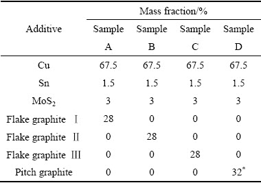 本实验使用的原料:电解铜粉,粒度25~38 μm,纯度≥99.0%;锡粉,粒度38~48 μm,纯度≥99.5%;二硫化钼粉,粒度≤44 μm,纯度≥98.5%;鳞片石墨粉,50号(石墨粒度(380±50) μm)、100号(石墨粒度(200±50) μm)和300号(石墨粒度(90±30) μm) 3种,按粒度由大到小依次记为鳞片石墨Ⅰ、Ⅱ、Ⅲ,纯度≥99.85%;含沥青鳞片石墨粉,沥青含量12.5%,粒度为100号(石墨粒度(200±50) μm)。