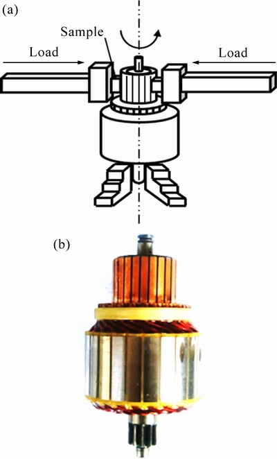 Fig. 1 Friction and wear testing system in energized state (a) and commutator (b)