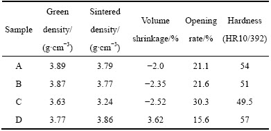 表2所列为4种试样的压坯密度、烧结密度、体积收缩率、开孔率及硬度。由表2可见,含粘结剂的试样A、B和C在烧结后的体积发生了膨胀,且膨胀程度随石墨粒度减小而增大;同时,随着石墨粒度的降低,试样的烧结密度和硬度逐渐下降,开孔率呈上升的趋势。而含粘结剂的试样D在烧结后则发生收缩,而其烧结密度和硬度均有明显的提高,开孔率则明显下降。